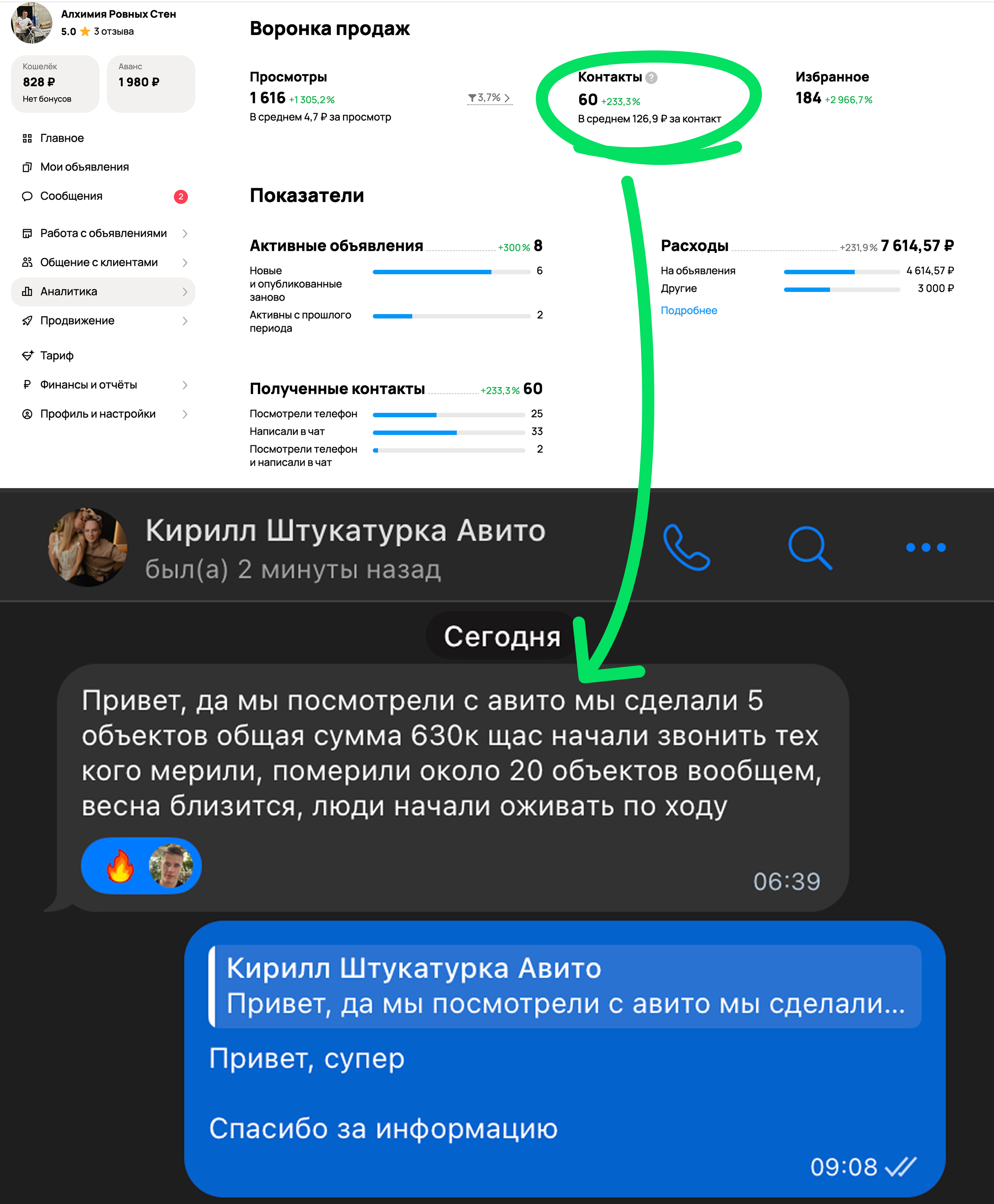 Так Кирилл из Новосибирска получил за 1 месяц 60 заявок по 126 рублей на механизированную штукатурку и сделал 5 объектов на 630 тысяч рублей 👆